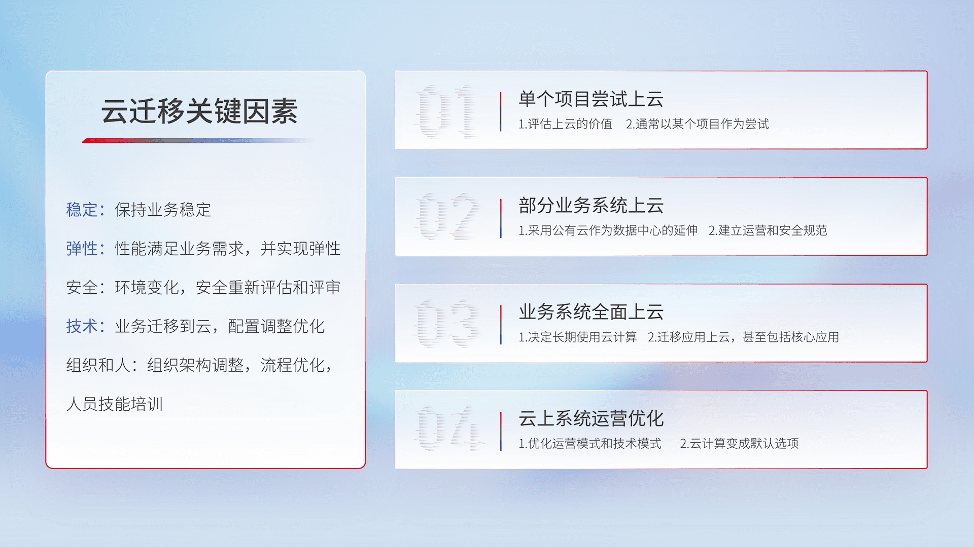 结合实际业务,,从规划设计、、、、云平台选型、、、云原生改造、、数据迁移、、、、集成交付,,,,迁移全过程为客户识别最佳上云路径,,做好风险识别管理,,设计网络架构、、、身份权限、、、、安全审计合规、、、、操作审计、、日志审计、、、监控告警策略、、、多站点容灾设计等,,对云上基础设施进行整体规划,,,提升IT治理水平,,,,以满足弹性、、、高可用、、、高性能的需求。。。。