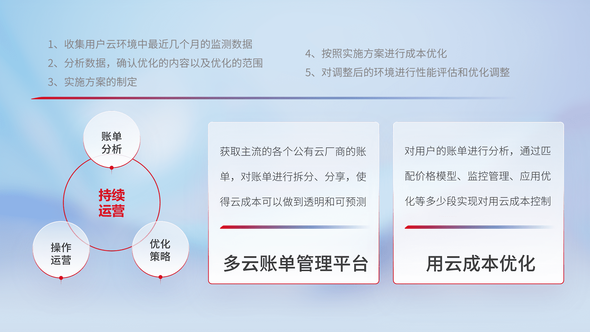 通过多云纳管,,以统一的资源数据模型把客户的云资源进行抽象和封装,,,,进而实现对多云资源的统一操作,,,,保障云资源管理的可靠性、、稳定性与可用性。。。量身定制化运维内容,,,配置、、开发运维、、、、补丁管理、、备份、、、监控、、、、认证和访问管理、、审计和日常巡检等,,保障在用云过程中的可靠度,,,,稳定度以及高可用率。。。。